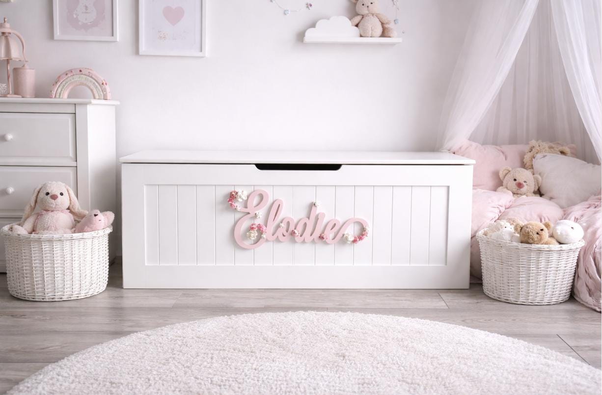 Bring a touch of personalisation to your little one’s room with our personalised toy box name,, designed with delicate flowers for a charming statement piece. Each sign is carefully crafted from durable MDF wood and finished to create a stunning piece of nursery wall art that will be treasured for years.